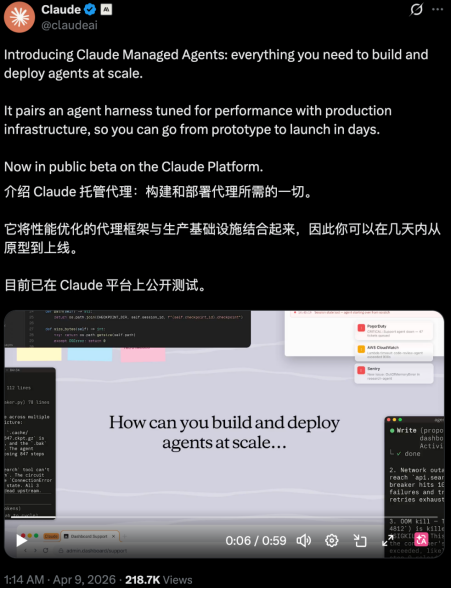 (本文作者为 字母AI,钛媒体经授权发布)文 | 字母AI凌晨,Anthropic 发布了Claude Managed Agents,一套用于构建和部署云端智能体的托管工具。用最简单的话来介绍 - 程一笑不是“盖世英雄”